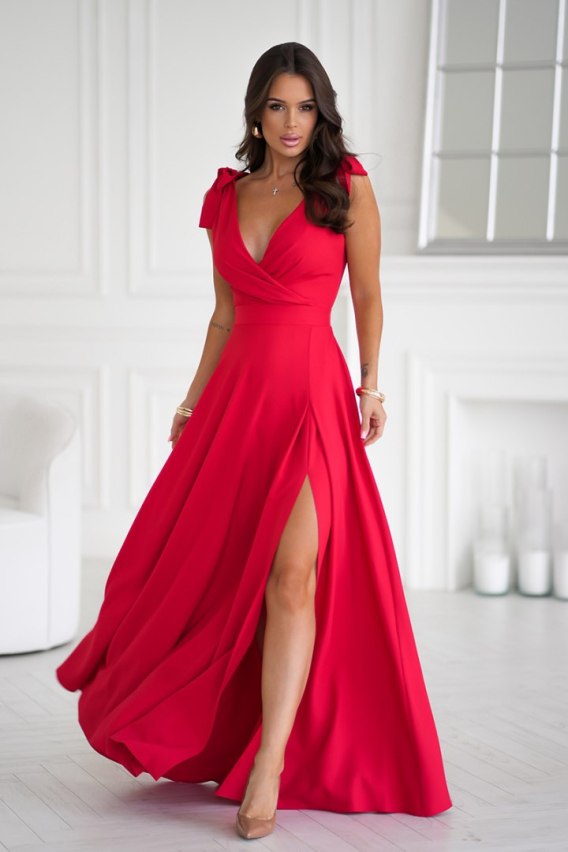 Elegancka, długa sukienka z rozcięciem na nodze, idealna na studniówkę, sylwestra i inne wyjątkowe okazje. Regulowane wiązania na ramionach w formie kokardek dodają jej subtelnego uroku i zapewniają perfekcyjne dopasowanie. Połączenie klasyki z nutą zmysłowości sprawia, że to idealny wybór na każdą imprezę okolicznościową!