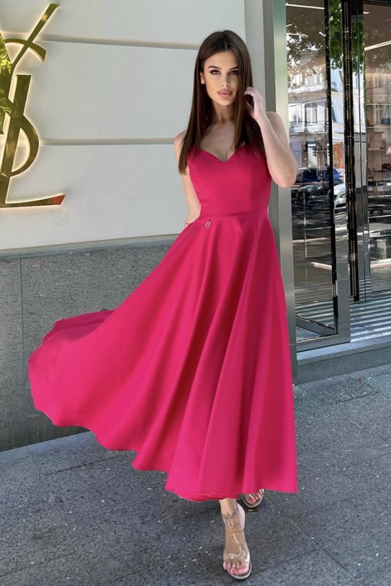 Sukienka midi na ramiączkach lekko rozkloszowana. Góra kreacji na cieniutkich ramiączkach, idealnie dopasowana w talii. Ramiona jak i plecy odsłonięte. Model dodający szyku i kobiecości. Dostępny w przeróżnych kolorach.