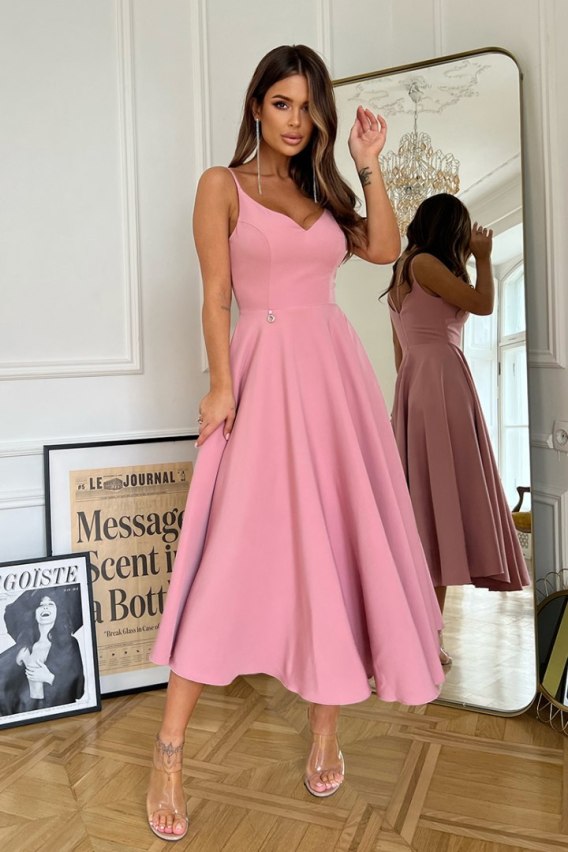 Sukienka midi na ramiączkach lekko rozkloszowana. Góra kreacji na cieniutkich ramiączkach, idealnie dopasowana w talii. Ramiona jak i plecy odsłonięte. Model dodający szyku i kobiecości. Dostępny w przeróżnych kolorach.