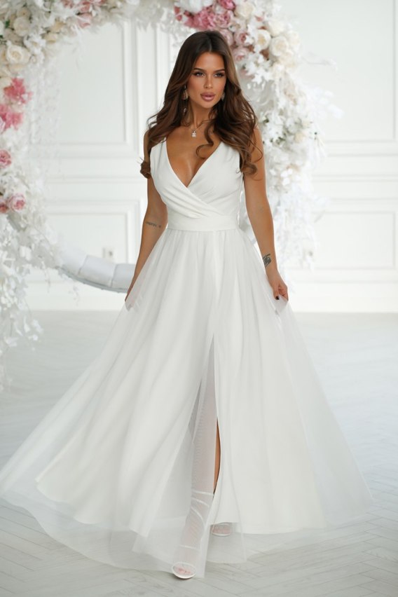Piękna długa sukienka , niezwykle zgrabna, uszyta ze zwiewnej tkaniny. Góra z delikatnym dekoltem, dół dwuwarstwowy z wycięciem na nodze, dodającym kreacji powabności. Do sukienki dołączony pasek. Dostępna w modnych kolorach.