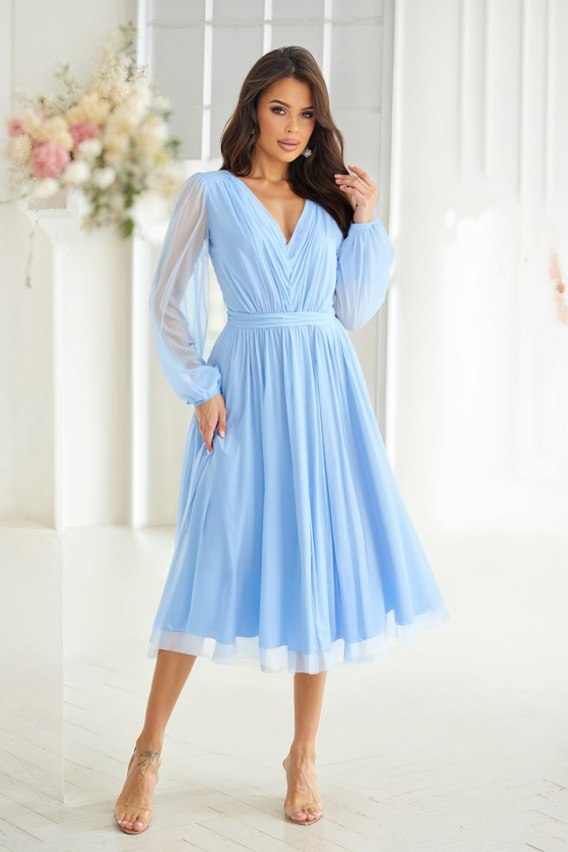 Sukienka midi z lekko rozkloszowaną warstwową spódnicą wykończoną brokatową siateczką. Góra kreacji marszczona z długimi rękawami zakończonymi gumką. Rękawki uszyte z takiej samej siatki co reszta sukienki. Dekolt i plecy w kształcie serka. Model dodający szyku i kobiecości. Dostępny w przeróżnych kolorach.
