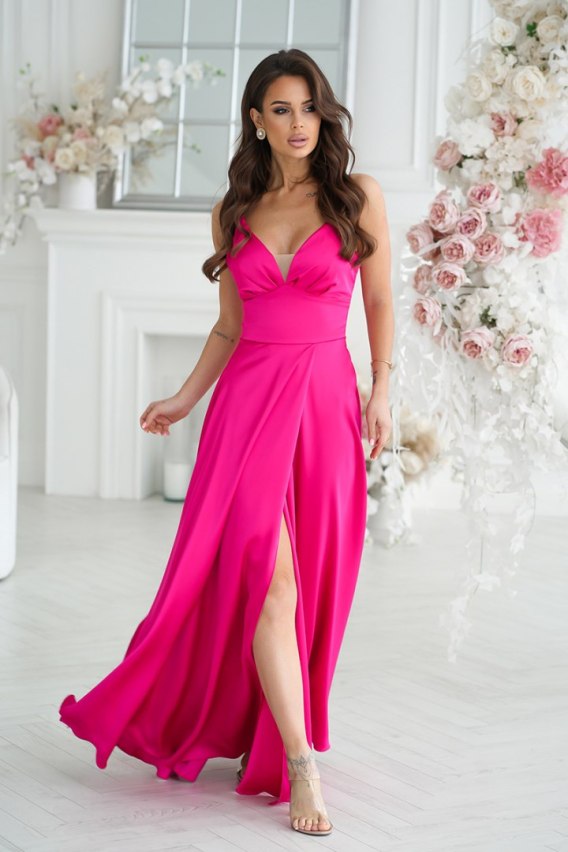 Piękna satynowa kreacja połączona z wyciętą góra na cieniutkich ramiączkach. Dół lejący się z rozcięciem na nodze. Model świetnie leży, idealnie skrojony, dostępny w modnych kolorach.