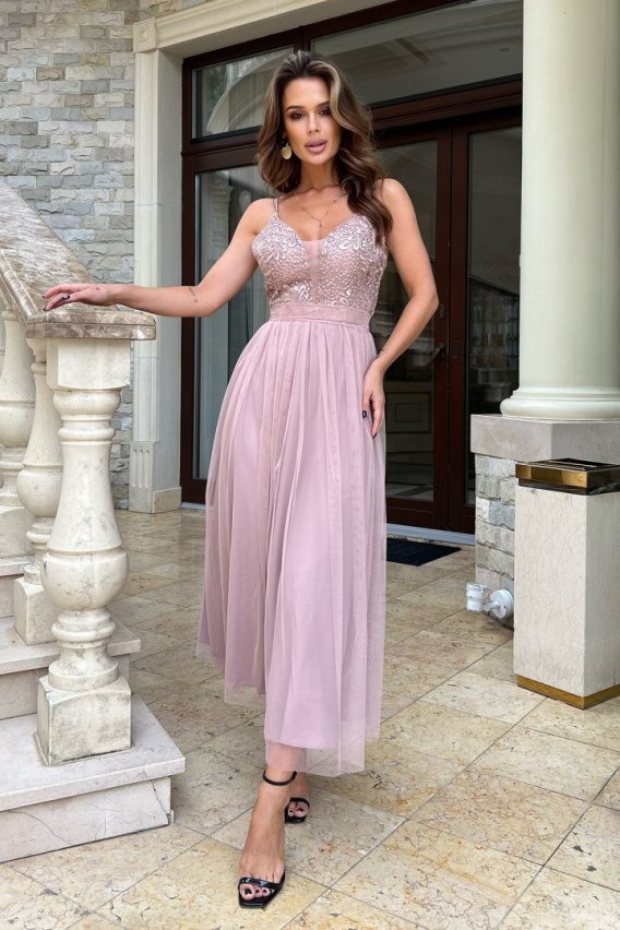 286-22 Tiulowa Sukienka Na Ramiączkach 7/8 - szampański
