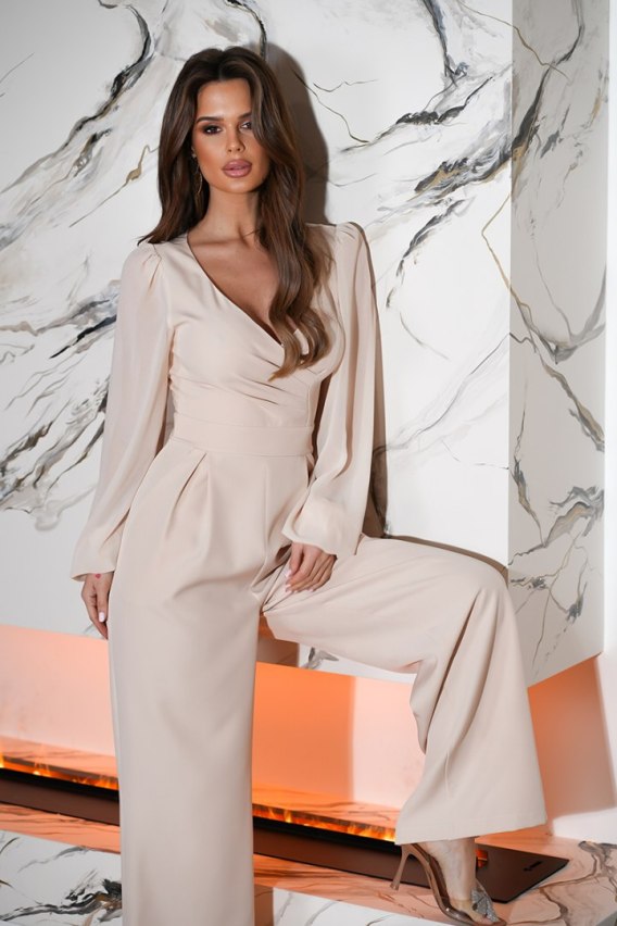 Elegancki kombinezon z długimi rękawami i szerokimi nogawkami. Dekolt przekładany delikatnie eksponuje biust. Model z idealnie skrojoną talią wyszczupla, a nogawki wydłużają sylwetkę. Rękawy szerokie zakończone ozdobnymi guziczkami. Dostępny w eleganckich jesiennych kolorach.
