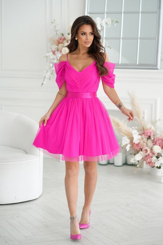 Piękna sukienka w stylu hiszpańskim z opadającymi tiulowymi rękawkami. Dół kreacji warstwowy, rozkloszowany, idealnie komponuje się z górą kreacji. Do modelu dołączony jest pasek. Dostępna w soczystych kolorach.