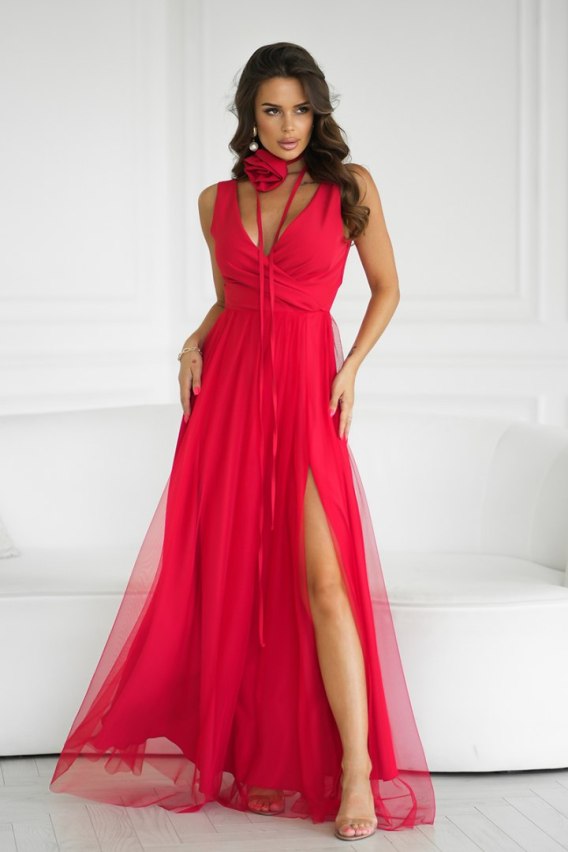 Piękna, długa sukienka, która zachwyca swoim niezwykłym krojem. Uszyta ze zwiewnej tkaniny, idealnie podkreśla sylwetkę. Góra sukienki posiada delikatny dekolt, a dwuwarstwowy dół z wycięciem na nodze dodaje kreacji powabności. Do sukienki dołączony jest pasek z różyczką, który można owinąć na wiele sposobów - zarówno na szyję, jak i na talię, co pozwala na indywidualne dopasowanie stylizacji.