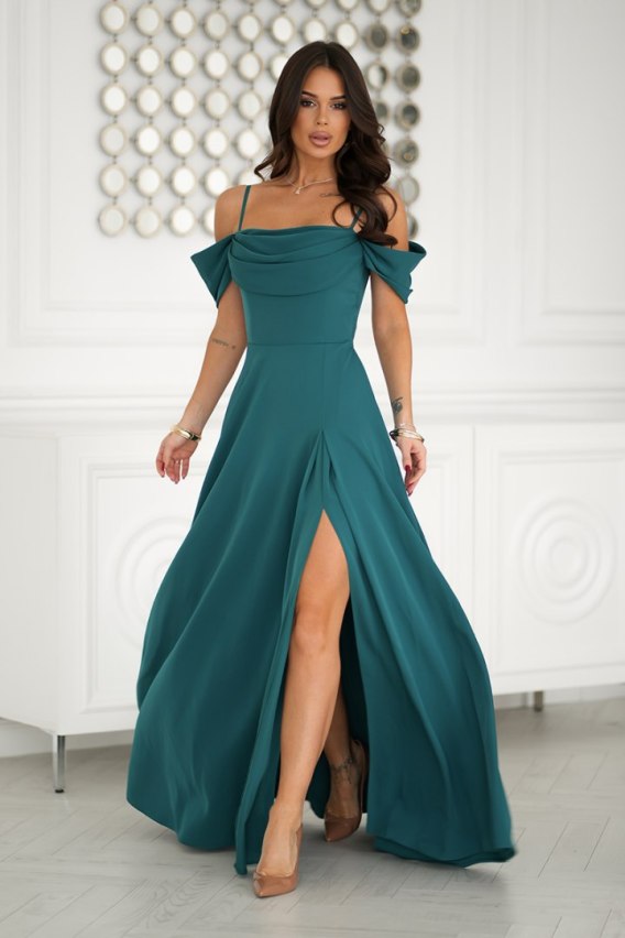 320-13 Sukienka Maxi Z Opadającymi Ramiączkami I Rozcięciem - zielony