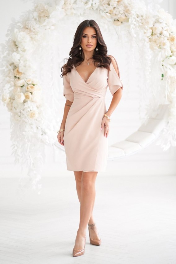 331-21 Elegancka Dopasowana Sukienka Z Odkrytymi Ramionami - beżowy