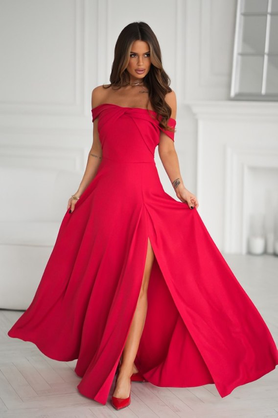 Wyjątkowo elegancka suknia maxi wykonana z lśniącej tkaniny, która pięknie odbija światło. Ma hiszpański dekolt z efektownym skręceniem materiału na biuście oraz dół o płynnym, rozkloszowanym kroju, który zapewnia zwiewny i olśniewający ruch. To idealny model na studniówkę, galę czy wesele.