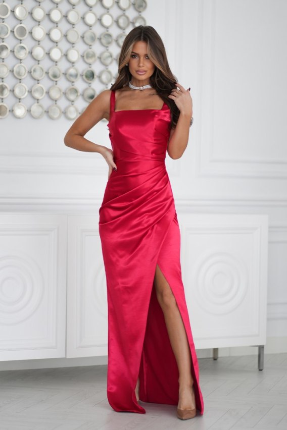 Olśniewająca satynowa suknia maxi, która łączy klasyczną elegancję z nowoczesnym blaskiem. Dopasowany fason z modnym, kwadratowym dekoltem pięknie modeluje biust, a gorsetowe sznurowanie na plecach gwarantuje idealne dopasowanie. Wysokie rozcięcie na nodze dodaje całości lekkości i niezaprzeczalnego, kobiecego uroku.