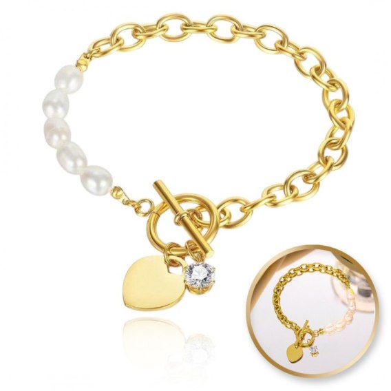 Modna bransoletka ze stali nierdzewnej platerowana 14 karatowym złotemŚwietnie pasuje do eleganckich, jak również do codziennych stylizacjiElegancki dodatek na każdą okazję, do sukienek, spódnic, spodenek.Wymiary:Długość: 19cm Zapięcie: ToggleWymiar kartonika:10 cm x 8 cmWaga:9g netto / 15g bruttoSTAL CHIRURGICZNA jest odporna na warunki atmosferyczne, nie ulega korozji, nie rdzewieje, nie śniedzieje.