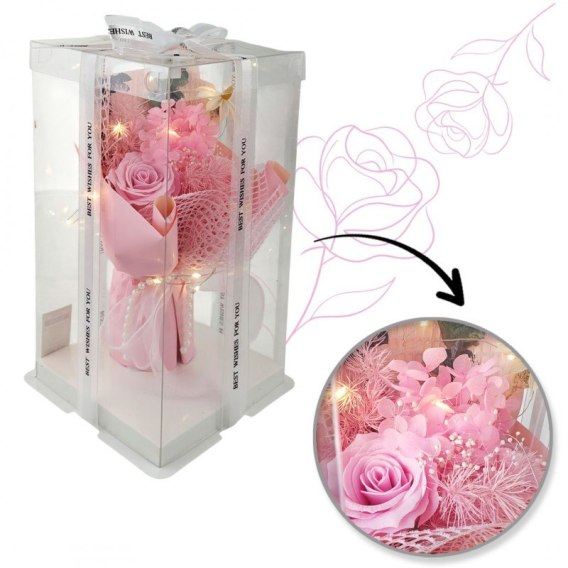 - Możliwość włączania i wyłączania lampek. Materiał: kwiaty mydlane / opakowanie z tworzywa sztucznego. Wymiary: