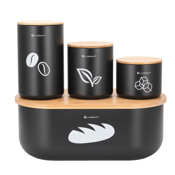 Chlebak kuchenny przyda się wszystkim tym, którzy chcą w odpowiedni sposób przechowywać pieczywo. Chlebak charakteryzuje się ciekawym, nowoczesnym designem. Pokrywa wykonana z drewna bambusowego może służyć również jako deska do krojenia. W zestawie znajdują 3 pojemniki kuchenne na kawę, herbatę i cukier.