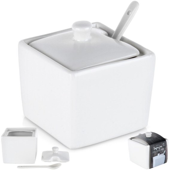 • PRAKTYCZNA - Cukiernica w kwadratowym kształcie z pokrywką i łyżeczką. Cukiernica ma wymiary 8,5 x 8,5 x 9 cm i pojemność 200 ml. Łyżka ma wymiary 9,5 x 2,5 cm.