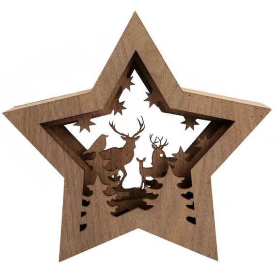 DEKORACJA ŚWIETLNA 10 LED DREWNIANA GWIAZDA Z RENIFERAMI 28 CM