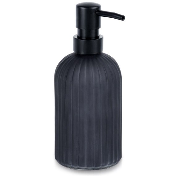 - SZKLANY - Dozownik wykonany z najwyższej jakości szkła, które pomalowane jest na czarny, matowy kolor. Pompka wykonana jest z tworzywa w czarnym kolorze. Pojemnik posiada pionowe, tłoczone paski.