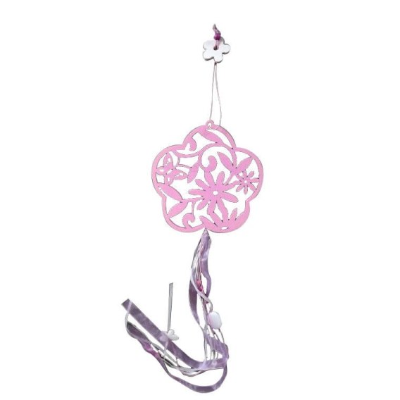 Drewniana zawieszka różowa kwiat z wstążkami i koralikami