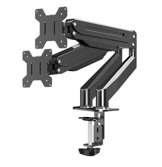 Metalowy, mocny i stabilny uchwyt biurkowy Esperanza MACHE do 2 monitorów komputerowych w rozmiarze od 17” do 27”. Pozwala zamontować monitor komputerowy na biurku w taki sposób aby można go było swobodnie regulować pod kątem widzenia i wyskości, a równocześnie aby monitor nie zajmował miejsca na biurku. Łatwy w montażu. Przytwierdzany do biurka mocnym, regulowanym metalowym imadłem z miękką wyściółką zapobiegającą rysowaniu się blatu biurka. Zgodny ze standardem VESA 75 x 75 mm – 100 x 100 mm. Posiada szeroki zakres regulacji położenia monitora góra/dół, regulację kąta nachylenia monitora oraz możliwość jego obrotu o 360o.