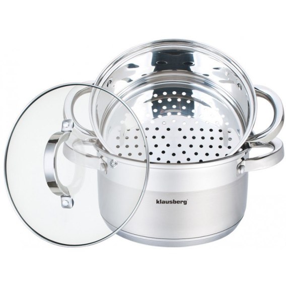 3 częściowy komplet garnków do gotowania na parze KLAUSBERG bazujący na garnku 5.0L / Ø24cm. Zestaw wykonany z wysokiej jakości stali nierdzewnej. Wykorzystana stal składa się z najlepszej jakości stopu powszechnie stosowanego w światowej klasy produktach, co gwarantuje jej wysoką odporność na korozję oraz bardzo dobrą wytrzymałość. Zastosowany materiał umożliwia szybkie podgrzanie potraw i przez dłuższy czas utrzymuje ciepło.