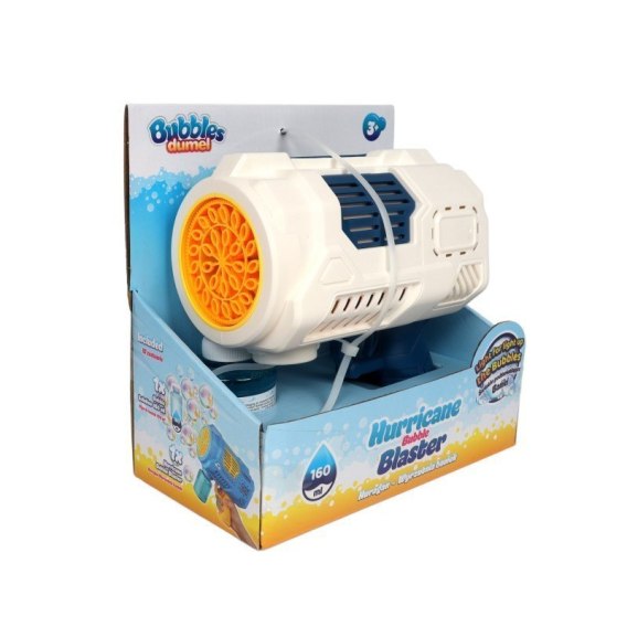 Gotowi na huragan bąbelkowej radości? Wyrzutnia wyczaruje nieprzerwany strumień baniek, a praktyczny uchwyt, w który została wyposażona, umożliwi jej łatwe przenoszenie z miejsca na miejsce. W zestawie, poza wyrzutnią, znajduje się płyn o pojemności 160ml, który należy wkręcić pod lufę wyrzutni przed rozpoczęciem zabawy. Zabawka zasilana jest dołączonym do zestawu akumulatorem, dzięki czemu nie wymaga użycia baterii. Gdy akumulator się rozładuje, wystarczy naładować go za pomocą kabla USB z zestawu i rozpocząć nową, bańkową przygodę. Z wyrzutni należy korzystać na świeżym powietrzu.