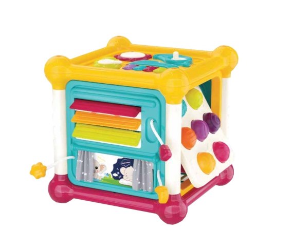Kolorowa kostka zabawi na wiele różnych sposobów, dostarczając maluszkom okazji do ćwiczenia rączek! Każda ze ścianek to inna aktywność. Znajdziemy tu trybiki do kręcenia, żaluzje do odsłaniania, zasłonki do rozsuwania, elementy do wciskania i wyciągania, sznureczki do przekładania klocków, dołączonych do zestawu, oraz ściankę muzyczną, na której znajdują się kształty instrumentów muzycznych, a umieszczone w nich przyciski uruchamiają dźwięki i melodie. W kostce kryje się też niespodzianka, w postaci ruchomej ścianki, której odchylenie umożliwia wygodne wyjmowanie włożonych wcześniej do kostki klocków.
