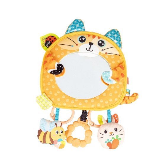 Ten śliczny kotek zapozna dzidziusia z własnym odbiciem, a wszystko za sprawą bezpiecznego lusterka, zdobiącego jego brzuszek. Zabawka wyposażona została w dodatkowe niespodzianki, a są nimi grzechotka, gryzak oraz szeleszcząca pszczółka. Materiały, z których wykonany został kotek i przyczepione do niego elementy odznaczają się zróżnicowanymi fakturami, przez co eksplorujący je maluch może rozwijać zdolności poznawcze, ucząc się odkrywać świat za pomocą zmysłów. Zabawkę można postawić, za pomocą zapinanej na rzep podstawki, lub powiesić na szczebelkach łóżeczka czy uchwycie wózka, na doszytych do zabawki zawieszkach i troczkach.