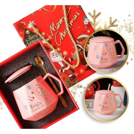 KUBEK ŚWIĄTECZNY - zestaw w pudełku z pokrywką i łyżeczką 225 ml, różowy KB08R