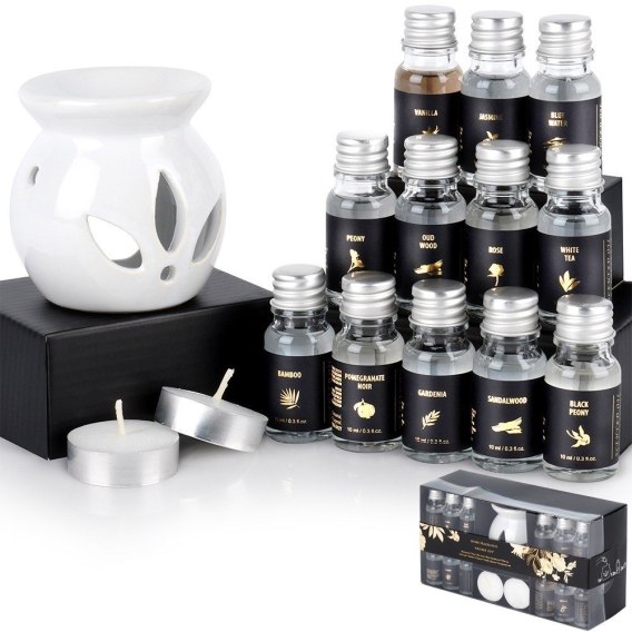 - Zestaw z kominkiem zapachowym i 12 olejkami - Zestaw zawiera elegancki kominek zapachowy o wymiarach 7 x 7,5 cm, 12 olejków zapachowych o pojemności 10 ml: czarna piwonia, owoce granatu, bambus, drzewny, wanilia, biała herbata, róża, piwonia, drzewo sandałowe, gardenia, jaśmin oraz niebieska woda. W zestawie również dwie świeczki typu tealight.