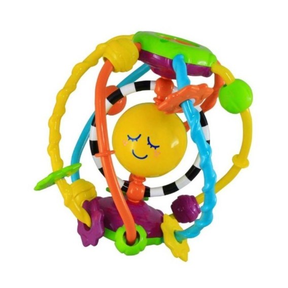Zabawka wspierająca rozwój sensoryczny malucha. Kula składa się z kolorowych linek oraz koralików o zróżnicowanej fakturze, stymulujących zmysł dotyku i wzroku. Na szczycie kuli znajduje się element, który przy przekręcaniu wydaje zabawny, terkoczący dźwięk.