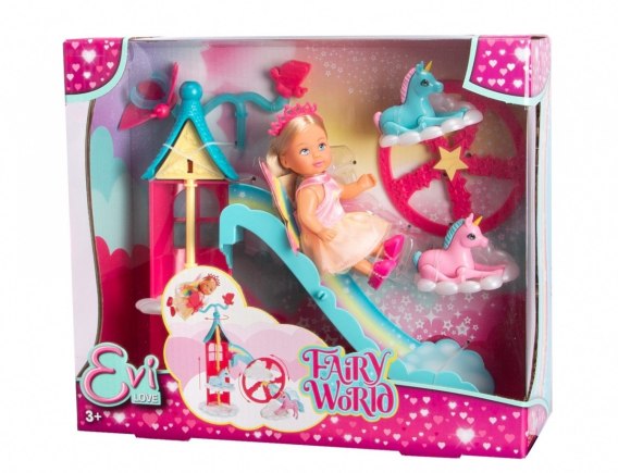 Przeżyj magiczne chwile z zestawem Evi Love Fairy. Wróżka Evi Love i jej 2 jednorożce przekształcają pokój każdego dziecka w magiczne miejsce. Ze swoimi kolorowymi wróżkowymi skrzydłami i piękną błyszczącą sukienką w pastelowych kolorach, Evi Love wygląda magicznie jak wróżka. Razem ze swoimi małymi jednorożcami Evi Love może przeżyć magiczne chwile jako wróżka na dołączonej wieży do zabawy. Zjeżdżalnia, winda napędzana korbą, a przede wszystkim magiczny diabelski młyn chmurka, na którym zmieszczą się oba jednorożce, gwarantują magiczną zabawę. Ciii! W wieży zabaw znajduje się schowek na magiczną różdżkę Evi Love! Lalka o wysokości 12 cm w uroczym stroju wróżki jest słodkim towarzyszem zabaw.