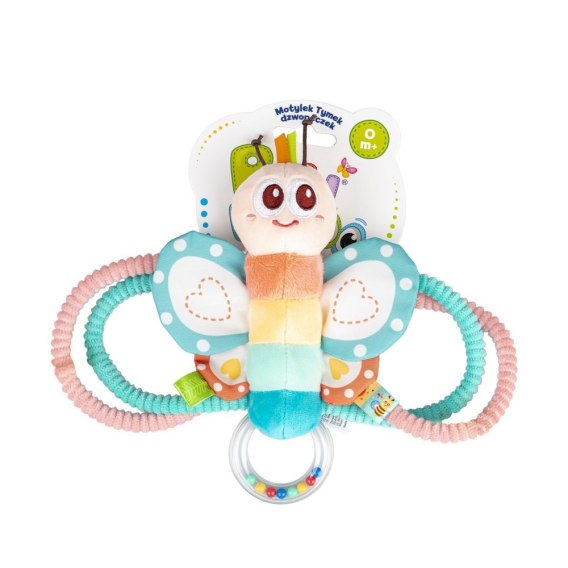 Tymek, szeleszcząc wesoło, zaprasza do sensorycznej zabawy! Kolorowy motylek wyposażony został w kryty dzwoneczek, który wydaje uroczy dźwięk przy każdym potrząśnięciu zabawką. Kolorowe, fakturowane obręcze, które zdobią Tymka są elastyczne i dostosowane do małych rączek, co ułatwia najmłodszym chwytanie zabawki. Jakby tego było mało, Motylek posiada także grzechoczący element, a jest nim przezroczysty krążek, wypełniony koralikami. Zabawka uszyta została z materiałów o zróżnicowanych fakturach, co pozwala rozwijać zdolności poznawcze malucha, zachęcając go do odkrywania świata za pomocą zmysłów.