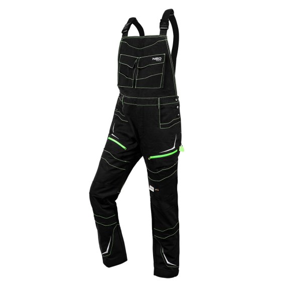 Ogrodniczki robocze PREMIUM PRO, czarne z neonowo zielonymi przeszyciami, skład materiału głównego: 100% bawełna Canvas o gramaturze 425 g/m2, skład materiałowy wzmocnień: 75% bawełna, 25% nylon, Cordura NYCO o gramaturze 272 g/m2, 14 wielofunkcyjnych kieszeni zapinanych na zamek lub zatrzaski magnetyczne, kieszenie na nakolanniki, podwójnie profilowane kolana, wzmocnienia z Cordury NYCO na kieszeniach, kolanach i nogawkach, potrójne szwy nogawek, możliwość wydłużenia nogawki o 4 cm, wentylacja na tyle nogawek, gumowe szelki z antypoślizgowym nadrukiem, zamki YKK, elementy odblaskowe 3M, wewnętrzna wszywka imienna, unikalny projekt własny, certyfikat CE, rozmiar L
