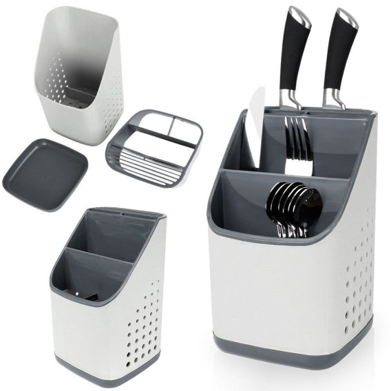 • ZDEJMOWANA PODSTAWKA - Dzięki specjalnej konstrukcji przybory nie stoją w wodzie, a ta nie spływa na blat kuchenny. Wyposażony w zdejmowaną podstawką do której spływa woda.