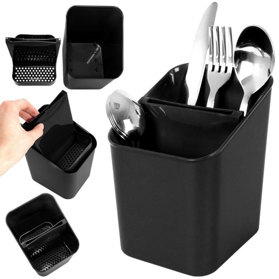 Pojemnik z 2 przegródkami, wykonany z wysokiej jakości tworzywa w kolorze czarnym. Świetnie sprawdzi się do ociekania oraz przechowywania sztućców, przyborów kuchennych.