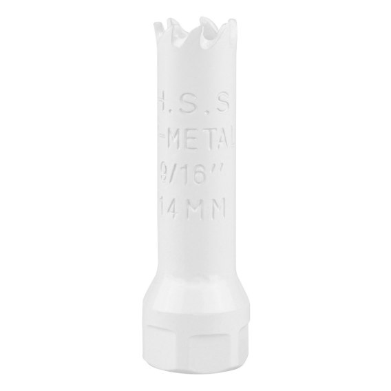 Otwornica bi-metalowa 14 mm, wysokość 56 mm, głębokość wiercenia: 38 mm, zastosowanie: metal, stal/Inox, żeliwo, mosiądz, aluminium, drewno, gwint: 1/2'' x 20 UNF , wykonane ze stali szybkotnącej HSS, do stosowania z 56T753 Adapter z wiertłem pilotującym do otwornic bi-metalowych 14-30 mm, Hex, średnica: 14 mm, max. prędkość obrotowa: stal: 580obr./min, stal Inox: 300 obr./min, aluminium: 900 obr./min, drewno: 800 obr./min, żeliwo: 400 obr./min, mosiądz: 790obr./min