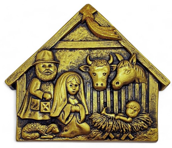 Płaska szopka betlejemska wykonana z gipsu, idealna jako dekoracja bożonarodzeniowa. Przedstawia scenę Narodzenia z figurami Świętej Rodziny, zwierząt oraz gwiazdy betlejemskiej. Wyposażona w zawieszkę, umożliwia łatwe umieszczenie na ścianie. Stylowy i elegancki dodatek do świątecznego wystroju.