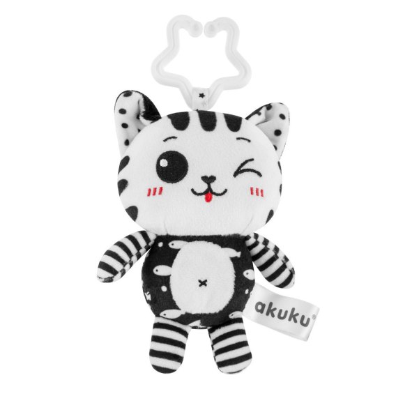 Pluszowa zawieszka Kotek bez wątpienia przykuje uwagę Twojego dziecka. Maskotka wyposażona jest w uniwersalny, łatwy do zaczepienia na wszelkich powierzchniach plastikowy uchwyt, dzięki czemu można ją zamocować w dowolnym miejscu w domu oraz w podróży. Czarno-białe kolory stymulują zmysł wzroku u niemowlaka, który jeszcze nie rozróżnia barw. Produkt wykonany z delikatnego materiału, który powoduje, że dziecko nie chce się z nimi rozstać. Rozwija koordynacje wzrokowo-słuchową i motoryczną malucha.