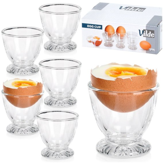 Zestaw 6 szt. podstawek na jajka wykonanych ze szkła. . Podstawki zapewnią stabilne i bezpieczne umieszczenie jajka na stole, bez ryzyka przewrócenia się. Nadają się do zmywarki.