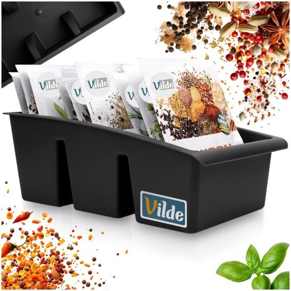 Pojemnik kuchenny na przyprawy w torebce. Solidnie wykonany z lekkiego tworzywa w kolorze czarnym. Z jego pomocą zapanuje porządek w szafce z przyprawami. Dzięki niemu posortujesz przyprawy i zawsze będziesz mieć dany produkt pod ręką. Szybko znajdziesz odpowiednią torebkę. Pojemnik pozwala utrzymać torebkę w przegródce, co zapobiega rozsypywaniu przypraw. Przyprawy i zioła będą utrzymane w porządku, a jeden organizer pomieści wiele torebek różnorakich produktów. Oryginalny produkt marki Vilde. Wyprodukowano zgodnie z europejskimi standardami.