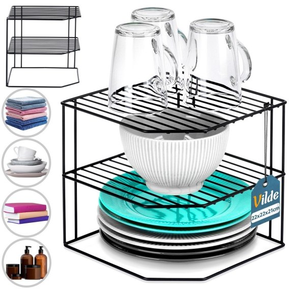 Narożna półka kuchenna wstawiana do szafki, pozwoli podzielić ją na trzy części, dzięki czemu zyskamy dodatkową przestrzeń do przechowywania akcesoriów kuchennych. Półka jest niezwykle uniwersalna, możemy postawić ją również w dowolnym miejscu. Idealne rozwiązanie dla tych, którzy chcą efektywnie wykorzystać dostępną przestrzeń w szafkach. Półka pozwala na lepsze zagospodarowanie pionowej przestrzeni, umożliwiając przechowywanie różnorodnych przedmiotów w zorganizowany sposób. Oryginalny produkt marki Vilde. Wyprodukowano zgodnie z europejskimi standardami.