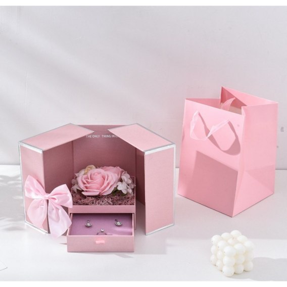 Pod przeźroczystą osłonką znajduje się 9 czerwonych mydlanych różyczek. Pudełeczko posiada wysuwaną szufladkę na naszyjnik lub bransoletkę. Wymiary pudełeczka:
