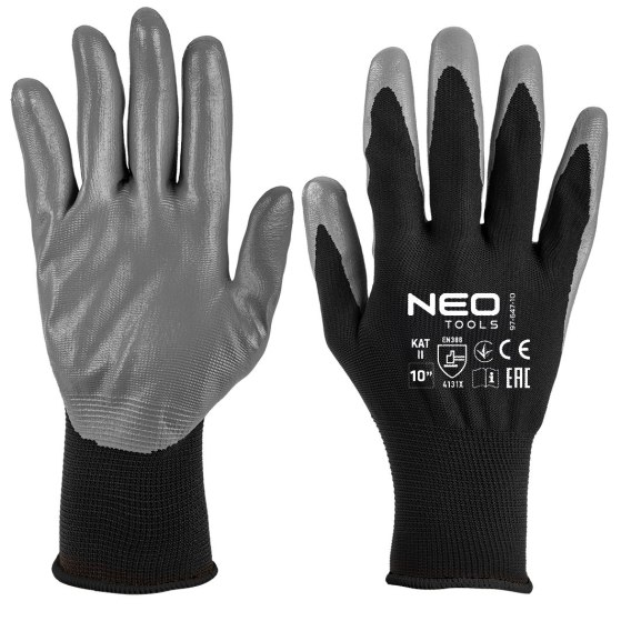 Rękawice robocze, poliester pokryty ntrylem, 4131X, rozmiar 11, materiał główny : poliester; pokrycie : nitrilem (smooth); KAT II , 4131X; EN 388: odporność na ścieranie (od 0 do 4) 4, odporność na przecięcie ostrym przedmiotem (od 0 do 5) 1, odporność na rozdzieranie (od 0 do 4) 3, odporność na przekłucie (od 0 do 4) 1, odporność na przecięcie wg EN ISO 13997 X; dobre dopasowanie do dłoni; zastosowanie: wszelkie prace transportowe, ogrodnictwo, budownictwo, przenoszenie, magazynowanie, składowanie, prace montażowe, produkcja drobnych elementów, majsterkowanie, Certyfikat CE
