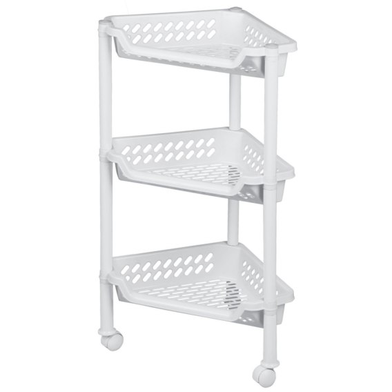 Trójkątny regał idealnie wpasuje się w narożnik pomieszczenia. Regał wyposażony w trzy półki z otworami zapewniającymi lepsze odprowadzanie wody i wentylację w miejscach wilgotnych takich jak łazienka. Regał został wyposażony w kółka ułatwiające przemieszczanie wózka.