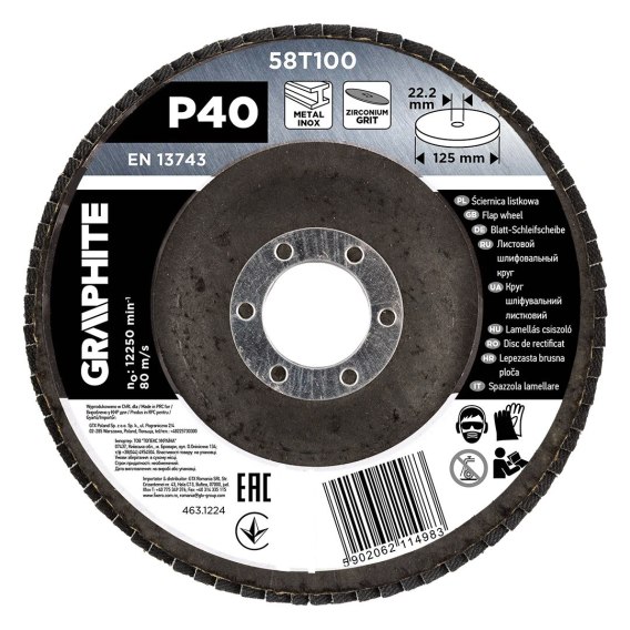 Ściernica listkowa cyrkonowa 125 x 22.2 mm, P40, RPM=12250 obr./min, 80 m/s, zastosowanie metal/Inox
