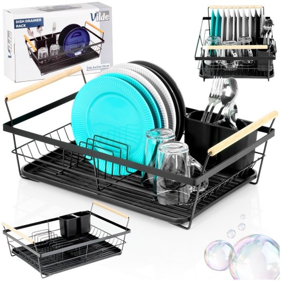 Elegancka suszarka do naczyń w kolorze czarnym kolorze z drewnianymi uchwytami. Posiada miejsce na talerze, szklanki oraz ociekacz sztućce. Wyposażona w wyjmowaną tacę ociekową.