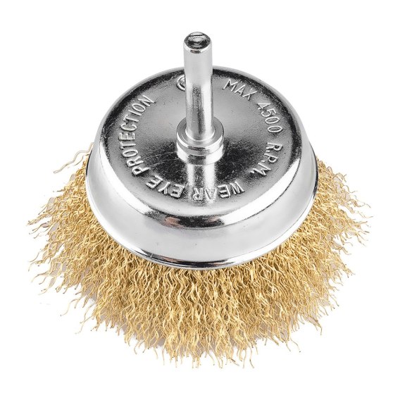 Szczotka druciana doczołowa 75 mm, drut karbowany, mosiądzowana, z trzpieniem 6 mm, max. prędkość obrotowa: 4500 obr./min, EN 1083-2