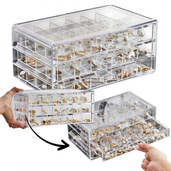Szkatułka na biżuterię, organizer transparentny - 3 szuflady, 72 przegródki Cechy produktu: