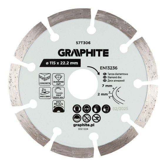 Tarcza diamentowa do cięcia segmentowa, 115 x 22.2 mm, na sucho i mokro o średnicy: 115mm, średnica otworu montażowego: 22,2mm, wysokość segmentu: 7 mm szerokość: 2 mm, maksymalna prędkość obrotowa: 80 m/s, rpm = 13200 obr./min, do cięcia: na sucho lub mokro, norma: EN 13236