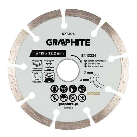 Tarcza diamentowa do cięcia segmentowa, 115 x 22.2 mm, na sucho o średnicy: 115mm, średnica otworu montażowego: 22,2mm, wysokość segmentu: 7 mm szerokość: 2 mm, maksymalna prędkość obrotowa: 80 m/s, rpm = 13200 obr./min, do cięcia: na sucho, norma: EN 13236