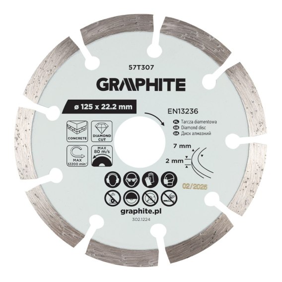 Tarcza diamentowa do cięcia segmentowa, 125 x 22.2 mm, na sucho o średnicy: 125mm, średnica otworu montażowego: 22,22mm, wysokość segmentu: 7 mm szerokość: 2 mm, maksymalna prędkość obrotowa: 80 m/s, rpm = 12200 obr./min, do cięcia: na sucho, norma: EN 13236